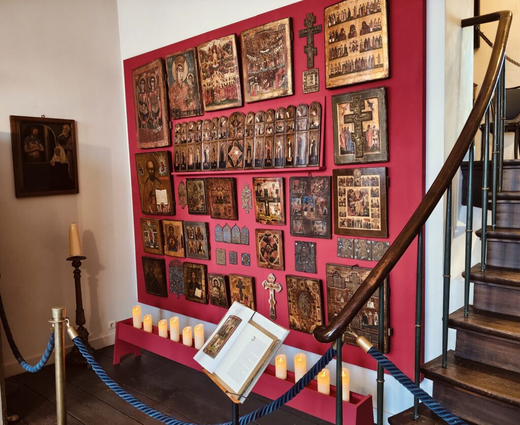 “De collectie iconen is door de laatste baron geschonken in ruil voor twee eeuwen bidden voor het zieleheil van zijn familie. Vanwege hun kwetsbaarheid werden de iconen veilig bewaard in een afgesloten kamer. Nu het kasteel tot een volwaardig museum is geworden, kunnen wij die veiligheid bieden én de mogelijkheid van een permanente expositie. Daarom zijn zij vanuit de abdij in bruikleen teruggeplaatst in het kasteel, tezamen in een indrukwekkende iconenwand. En met een sfeervol flakkerend kaarslicht (uiteraard van LED-kaarsen). Overste Frank van Roermund heeft in december de iconenwand onthuld en sindsdien zijn de iconen dagelijks te bewonderen. En het bidden voor de baron: dat geschiedt op de abdij.”